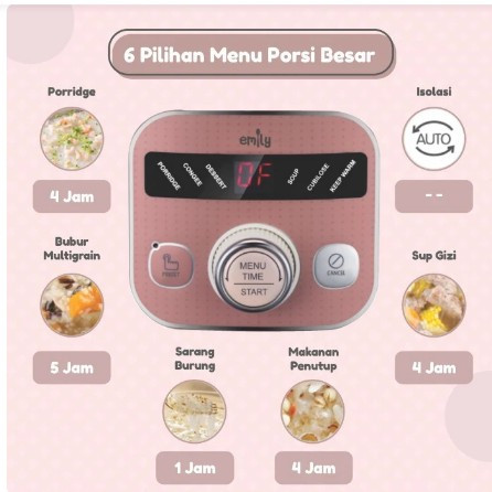 Emily slow cooker 1 liter (ESC-34003) adalah pengolah makanan multifungsi untuk membuat MPASI (Makanan Pendamping ASI) untuk anak, dan bisa juga digunakan untuk memasak menu makanan keluarga.
