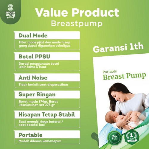 Mom uung breast Pump merupakan produk pompa asi Portable, Wireless dengan dual mode yakni mode hisap dan mode pijat. Memberikan kenyamanan dan ketenangan saat memompa dengan suara hisapan yang lembut.