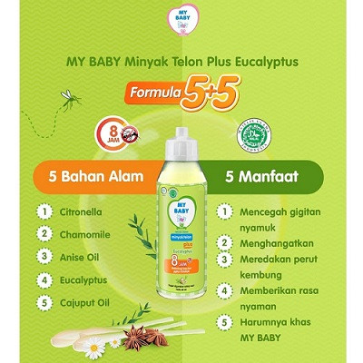 My baby minyak telon plus eucalyptus/lavender adalah minyak telon yang akan menjaga kehangatan tubuh si kecil. Dibuat dari bahan alami (eucalyptus, citronella, dan chamomile) yang nyaman untuk tubuh bayi. Manfaat : - Menjaga kehangatan tubuh si kecil - Meredakan kembung dan masuk angin - Melindungi dari gigitan nyamuk hingga 8 jam