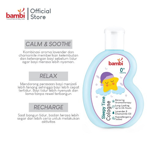 Berikan keharuman dan kesegaran pada si kecil dengan menggunakan bambi baby cologne100ml. Baby cologne ini diperkaya dengan anti irritant complex untuk melindungi dan mencegah iritasi pada kulit bayi. Manfaat : - Aroma ringan dan menenangkan - Kesegaran yang tahan lama - Lembut pada kulit
