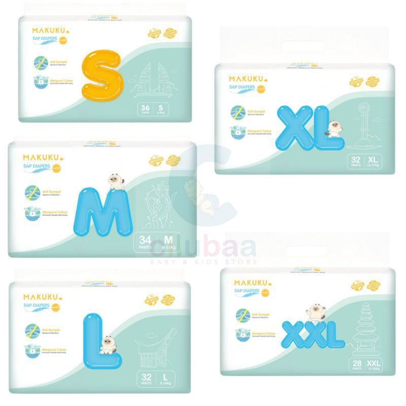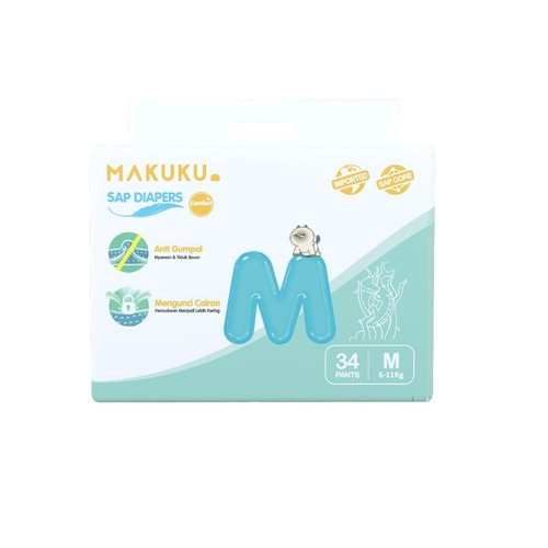 Makuku air diapers comfort+ merupakan popok new generation SAP core structure pertama di Indonesia, popok generasi terbaru dengan struktur yang stabil membuat popok makuku tidak mudah menggumpal dan jatuh, serta membuat bayi tidak merasa berat saat bergerak. Penyerapan kecepatan tinggi membuat air yang masuk ke popok akan cepat diserap merata sehingga dapat melindungi pantat bayi dari iritasi. Keunggulan: - Anti gumpal/anti-clumping (with new generation SAP core structure pertama di Indonesia), SAP adalah polymer hidrophilik yang memiliki kemampuan dapat menyerap cairan hingga lebih dari 100x lipat dari berat SAP sendiri. Penyerapan merata dan strukturnya sangat stabil sehingga tidak menggumpal dan jatuh, membuat bayi tidak merasa berat saat bergerak. - Penyerapan cepat, mengunci cairan dengan baik, tidak ada osmosis, mengurangi ruam merah. Ketika bayi duduk ataupun digendong, popok tidak akan osmosis balik. Bagian bawah, samping, dan belakang tidak akan terjadi kebocoran. - Tetap kering selama 8 jam sehingga mengurangi terjadinya iritasi pada kulit si kecil. - Permukaan rongga udara, sirkulasi 2 arah features ini mempunyai kelebihan seperti mengurangi kebocoran pada bagian bawah serta mengurangi terjadi ruam/iritasi pada kulit.