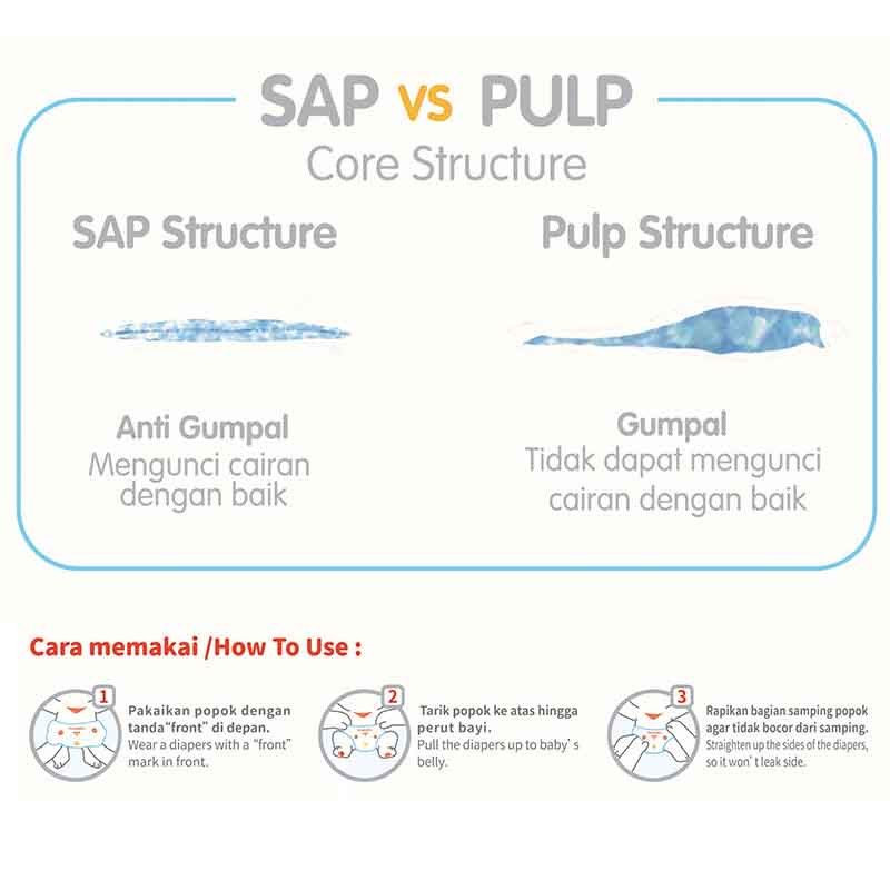 Makuku sap diapers comfort fit merupakan popok new generation SAP core structure pertama di Indonesia, popok generasi terbaru dengan struktur yang stabil membuat popok makuku tidak mudah menggumpal dan jatuh, serta membuat bayi tidak merasa berat saat bergerak. Penyerapan kecepatan tinggi membuat air yang masuk ke popok akan cepat diserap merata sehingga dapat melindungi pantat bayi dari iritasi. Keunggulan: - Tidak menggumpal, sehingga membuat bayi lebih nyaman - Penyerapan merata, sehingga mengurangi kebocoran - Daya serap yang tinggi dan cepat, sehingga menjaga permukaan tetap kering dan mampu secara efektif mengurangi ruam merah pada kulit bayi. - Penyerapan cepat, mengunci cairan dengan baik, tidak ada osmosis dan mengurangi ruam merah. - Popok 3 lapis, celana pull-up tiga lapis yang dilapisi dengan karet elastis di sekitar pinggang, dan bagian tepi di tutupi dengan karet elastis yang lebih fleksible mengikuti berbagai bentuk postur tubuh bayi guna meminimalisir terjadinya kebocoran samping. - Memiliki fitur Wet Indikator sehingga mempermudah parents untuk mengetahui apakah popok sudah penuh dan sebagai pengingat untuk mengganti popok.