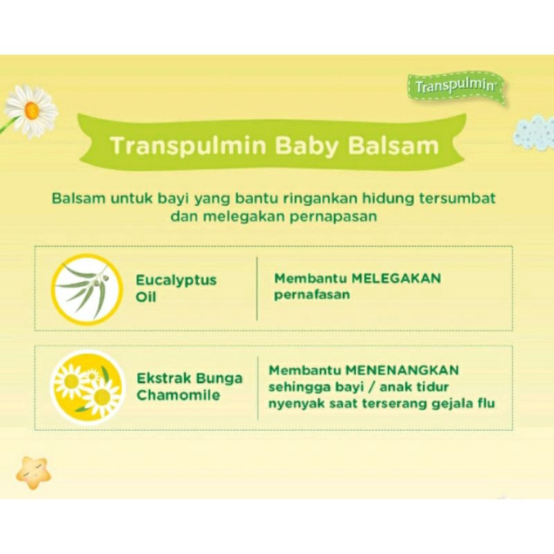 Transpulmin BB mengandung bahan alami Eucalyptus dan chamomile.