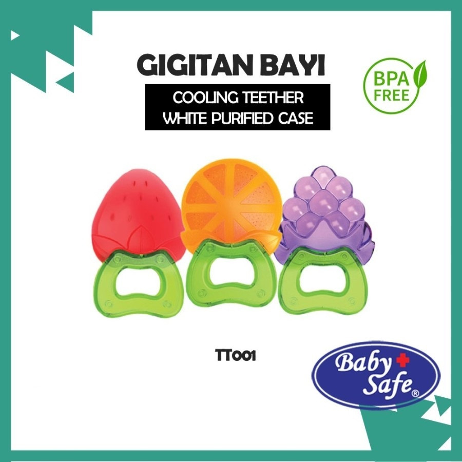 Baby safe cooling teether with purified water merupakan gigitan bayi yang dirancang untuk mendinginkan atau menenangkan gusi yang gatal dan meradang selama tahap pertumbuhan gigi. Teether ini berisi air steril dan dapat didinginkan di dalam kulkas (bagian cooler) sebelum digunakan si kecil. Terbuat dari bahan yang aman bebas dari Bisphenol A dan PVC. Dilengkapi dengan pegangan untuk memudahkan si kecil menggenggam teether.