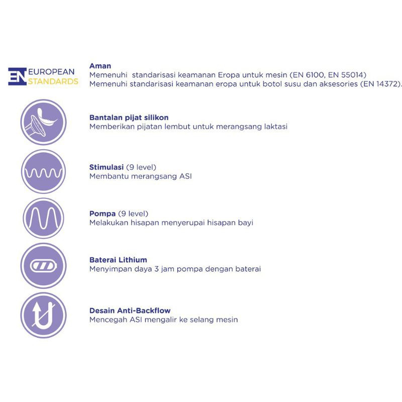 Dengan desain anti-backflow untuk mencegah ASI mengalir balik ke pompa sehingga lebih higienis dan ASI tertampung maksimal. Mesin breastpump ini memiliki fitur auto memory untuk menyimpan setting terakhir pakai. Lulus uji standarisasi keamanan Eropa untuk mesin dan botol susu.