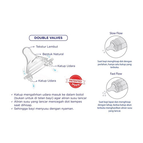Baby safe wide neck bottle merupakan botol susu bayi dengan leher lebar. Dotnya memiliki katup udara ganda yang dapat menyesuaikan aliran susu dengan daya isap bayi. Slow flow, saat bayi mengisap dot dengan perlahan, hanya satu katup yang terbuka. Fast flow, saat bayi lapar dan mengisap dot dengan lahap, kedua katup akan terbuka menghasilkan aliran susu yang lebih banyak. Katup udara pada dot baby safe mengalirkan udara masuk ke dalam botol (bukan untuk ditelan bayi), agar aliran susu lancar. Aliran susu yang lancar mencegah dot kempes saat diisap, jadi si kecil dapat menyusu dengan nyaman. Bentuk dotnya natural menyerupai payudara Ibu, serta tektur silicone yang lembut dan kenyal untuk diisap bayi. Botolnya didesain dengan aneka karakter lucu dan dan warna menarik, untuk menambah keceriaan si kecil saat minum