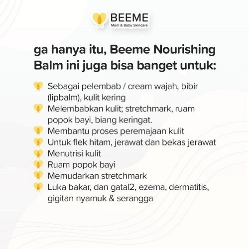 Aman untuk ibu hamil, ibu menyusui dan bayi bahkan bayi 0 bulan (newborn). Tidak berbahaya apabila tidak sengaja tertelan. Beeme nourishing balm dapat digunakan pada malam hari sebagai sleeping mask. Jikalau ada toner boleh pakai toner terlebih dahulu dan jika ada serum maka serum dahulu. Beeme nourishing balm distep terakhir (apabila memiliki cream malam sebaiknya penggunaan di selang-seling bergantian). Pada kulit yang bermasalah seperti yang disebutkan dibawah gunakan secara rutin, dalam sehari boleh dioles kembali bila balm sudah meresap.