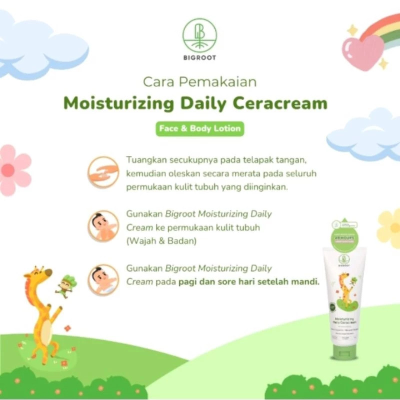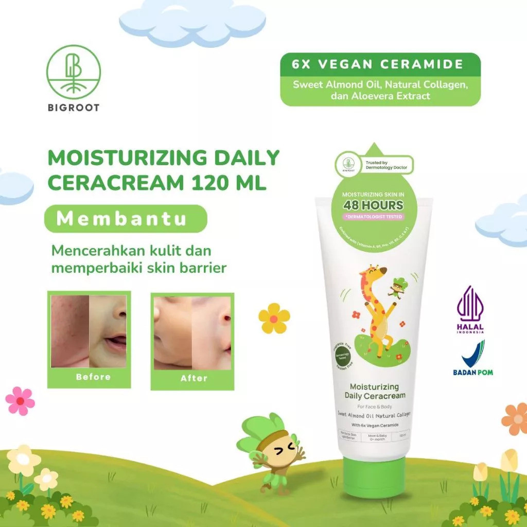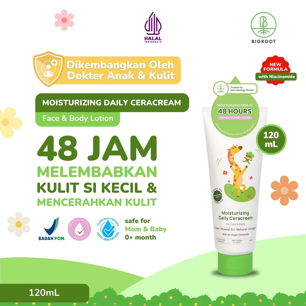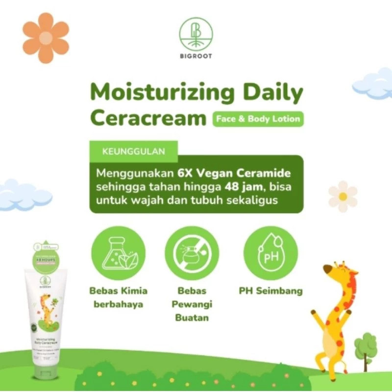 Bigroot Moisturizing Daily Ceracream Face & Body Lotion With 6x Vegan Ceramide - 48 Jam Melembabkan Kulit - merupakan krim lotion yang memberikan perlindungan, melembabkan, dan memperkuat skin barrier dengan cara memperbaiki lapisan sel kulit mati sehingga mempercepat proses regenerasi sel kulit baru secara alami. - Melembabkan Kulit Kering - Aman Untuk Kulit Sensitif - Lembut, Mudah Terserap, dan Tidak Lengket di Kulit - mengandung bahan natural alami Sweet Almond Oil Natural Collagen with 6x Vegan Ceramide - New formula dengan kandungan Extra Niacinamide yang dapat membantu mencerahkan kulit wajah dan tubuh anak - Paraben Free - Fragrance Free - bisa digunakan dari usia newborn, mom and baby 0+ month - Face and Body lotion dengan volume 120ml Reguler dan 20ml Travel Size cara penggunaan - Gunakan Bigroot Moisturizing Daily Cream ke seluruh permukaan kulit tubuh (Wajah dan Badan) dengan memijat lembut - Gunakan Bigroot Moisturizing Daily Cream pada pagi dan sore hari setelah mandi. -Tuangkan secukupnya pada telapak tangan, kemudian oleskan secara merata pada seluruh permukaan kulit tubuh yang diinginkan.