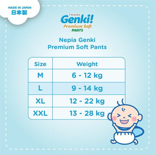 Kelembutan dari Nepia Genki Premium Soft Pants cocok digunakan untuk si Kecil yang masih memiliki kulit sensitif agar terhindar dari iritasi. Dengan daya serap yang tinggi, Nepia Genki Premium Soft Pants mampu mencegah terjadinya bocor saat si Kecil beraktivitas di siang dan malam hari. Desain yang dirancang untuk membalut ukuran pinggang si Kecil dengan bahan lembut, membuat si Kecil semakin nyaman menggunakan popoknya tanpa khawatir rewel.