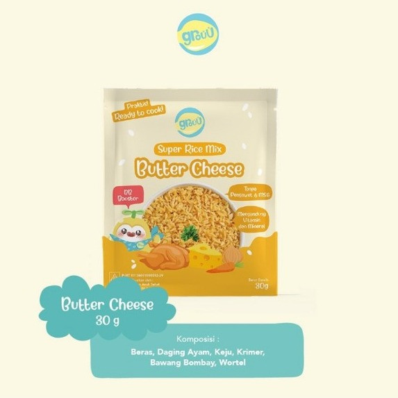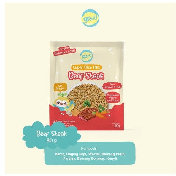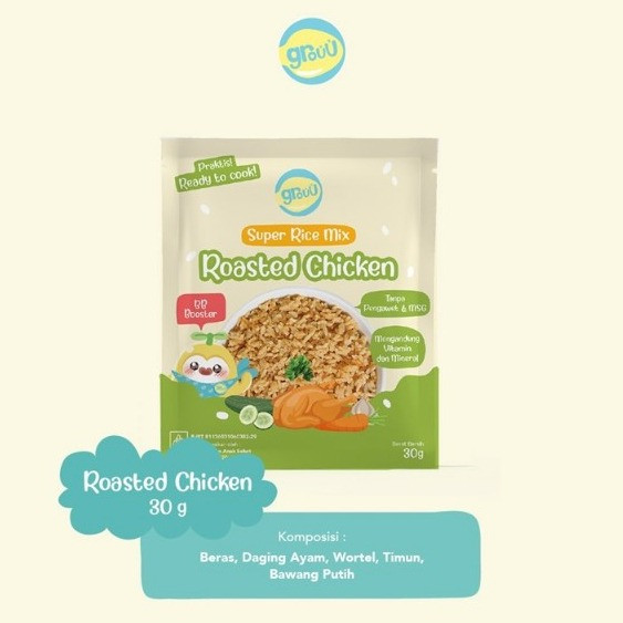 Grouu Super Mix Rice terbuat dari beras jepang asli yang pulen dengan campuran daging ayam/sapi atau ikan teri beserta sayur asli, tanpa tambahan pengawet dan MSG yang merupakan pilihan tepat untuk menambah berat badan (BB Booster) dan nafsu makan si Kecil.