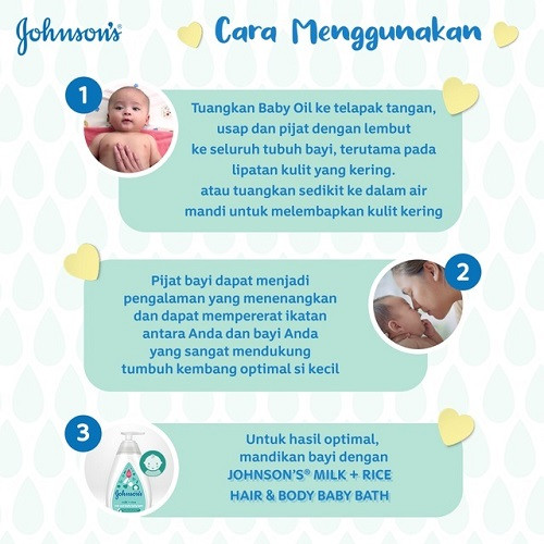 Cara Pakai : Usapkan ke seluruh tubuh terutama pada lipatan kulit, tau tuangkan sedikit ke dalam air mandi. Komposisi : Mineral Oil, Fragrance. Johnson's Baby Oil merupakan pilihan tepat untuk menjaga kelembutan kulit buah hati Anda