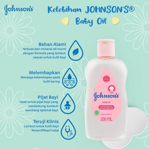 Johnson's Baby Oil merupakan baby oil yang terbuat dari minyak mineral murni untuk membersihkan, melembabkan dan menjaga kulit bayi agar tetap halus. Johnson's Baby Oil menjaga kulit buah hati Anda dari kekeringan dan menjadikannya 10x lebih lembut.
