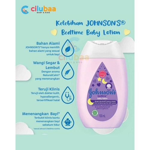b. Johnson's baby lotion bedtime (purple) merupakan lotion yang diperkaya dengan aroma NaturalCalm yang terdiri dari jasmine dan lily, secara klinis terbukti membantu dalam menenangkan dan memberi kenyamanan pada bayi sebelum tidur (berdasarkan rutinitas tidur bayi). Lotion ini telah teruji oleh dermatologi, hypo-allergenic dan pH-balanced, sehingga lebih aman dan tidak menyebabkan alergi pada kulit bayi.