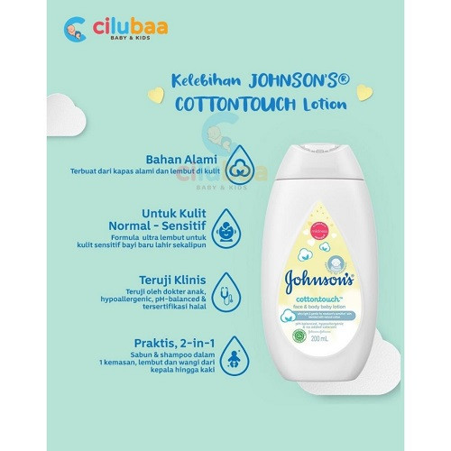d. Johnson's cotton touch face & body baby merupakan lotion bertekstur sangat ringan dan lembut untuk kulit bayi baru lahir yang sensitif (jika dibandingkan dengan kulit orang dewasa). Lotion bertekstur sangat ringan dan lembut untuk kulit bayi baru lahir yang sensitif.