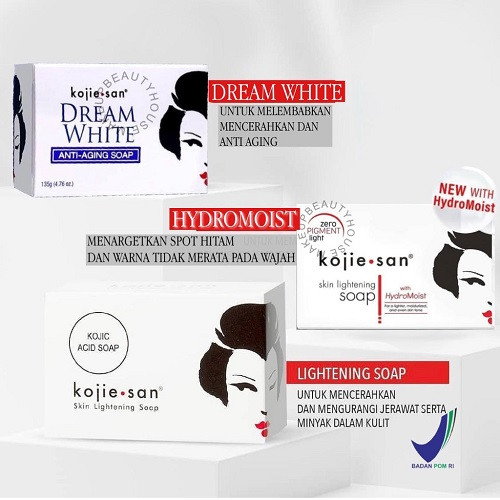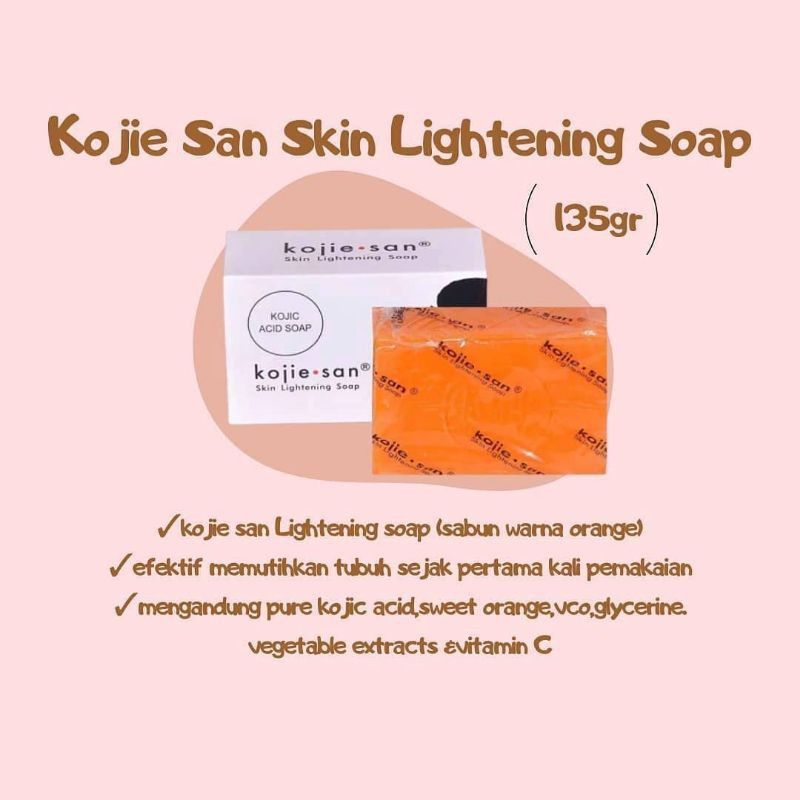 Terbuat dari kombinasi asam kojic, yang mengurangi pembentukan melanin, dan minyak kelapa murni bermutu tinggi yang sangat melembabkan kulit. Kojie san adalah sabun asam kojic pertama dan asli didistribusikan di Filipina. Kojie San Skin Lightening Soap berfungsi untuk menghilangkan jerawat, bintik-bintik di wajah, pigmentasi kulit, daging kecil yang sering tumbuh di wajah dan leher. Kojic Acid bersifat menghambat pertumbuhan melanin dikulit wajah dan tubuh kita sehingga dapat meyebabkan kulit menjadi lebih cerah. Kojie San sangat efektif memutihkan juga menghilangkan bekas bekas jerawat di wajah & badan.Hasil yang didapat dari sebagian orang,sabun kojie san ini dapat memutihkan dengan cepat,hanya sekitar 7 - 14 hari untuk pemakaian rutin 2x sehari. Kegunaan : Mencegah produksi melanin, menyamarkan sport-sport hitam, bekas jerawat, guratan kulit, dan warna kulit yang belang jadi lebih cerah dan merata seperti warna semula. Cara Pemakaian : 1. Basuh badan & wajah dengan air 2. Busakan sabun dengan menggunakan puff / tangan. 3. Usap busa secara merata seluruh tubuh&wajah,gosok-gosok busa secara seksama,lalu diamkan 3-5 menit agar kandungan whitening yang terdapat di busa sabun meresap ke pori-pori kulit. 4. Bilas dengan air bersih,dan lihat langsung hasilnya pada pemakaian pertama. Komposisi : Cocos nucifera(Coconut) Oil, De-ionized Water, Sodium Hydroxide, Fragrance, Kojic Acid, Glycerin, Aqua (and) Xantan Gum (and) Caprylyl Glycol (and)Glucose (and) Chondrus crispus (Carrageenan) (and) Phenoxyethanol (and)Ethylhexylglycerine, Cocodiethanolamide, Mineral Oil, Melaleuca alternifolia (Tea Tree) Oil, CI 15985, CI 19140, BHT