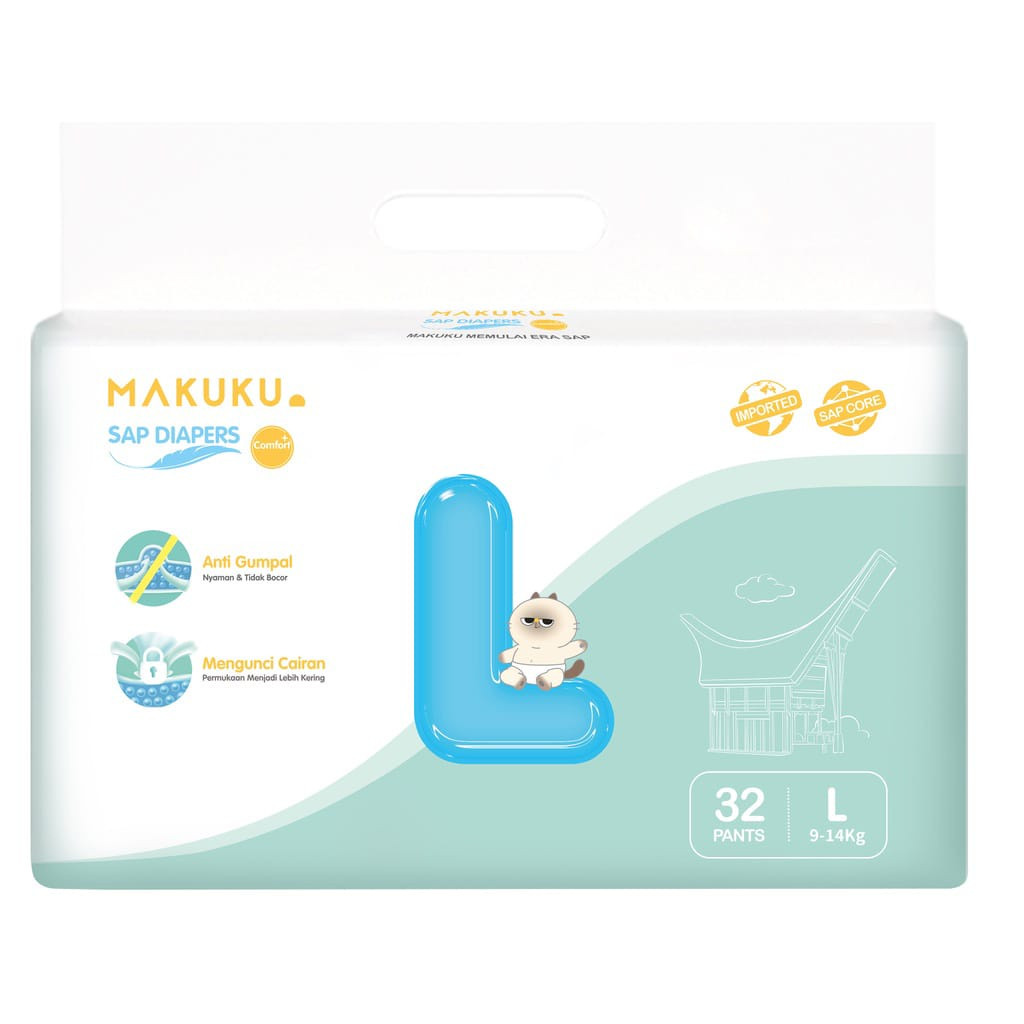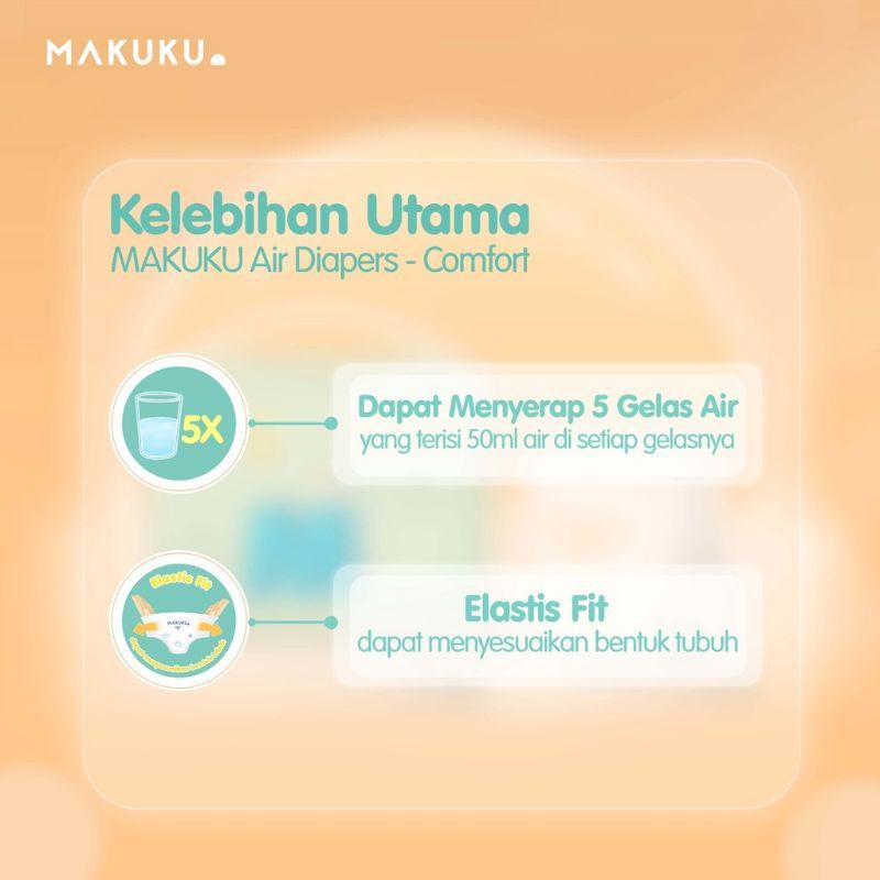 Makuku air diapers comfort+ merupakan popok new generation SAP core structure pertama di Indonesia, popok generasi terbaru dengan struktur yang stabil membuat popok makuku tidak mudah menggumpal dan jatuh, serta membuat bayi tidak merasa berat saat bergerak. Penyerapan kecepatan tinggi membuat air yang masuk ke popok akan cepat diserap merata sehingga dapat melindungi pantat bayi dari iritasi. Keunggulan: - Anti gumpal/anti-clumping (with new generation SAP core structure pertama di Indonesia), SAP adalah polymer hidrophilik yang memiliki kemampuan dapat menyerap cairan hingga lebih dari 100x lipat dari berat SAP sendiri. Penyerapan merata dan strukturnya sangat stabil sehingga tidak menggumpal dan jatuh, membuat bayi tidak merasa berat saat bergerak. - Penyerapan cepat, mengunci cairan dengan baik, tidak ada osmosis, mengurangi ruam merah. Ketika bayi duduk ataupun digendong, popok tidak akan osmosis balik. Bagian bawah, samping, dan belakang tidak akan terjadi kebocoran. - Tetap kering selama 8 jam sehingga mengurangi terjadinya iritasi pada kulit si kecil. - Permukaan rongga udara, sirkulasi 2 arah features ini mempunyai kelebihan seperti mengurangi kebocoran pada bagian bawah serta mengurangi terjadi ruam/iritasi pada kulit.