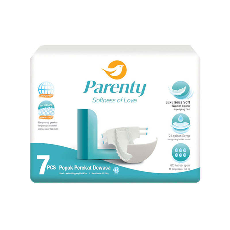 Parenty adalah popok dewasa dengan daya serap yang tinggi dimana mengandung pulp yang memiliki penyerapan air yang baik dan umumnya terbuat dari kayu jenis konifera (kayu lunak) dengan serat panjang, kekuatan yang baik dan warna yang sangat putih. Pulp memiliki karakteristik penyerapan yang cepat dan ada penambahan SAP berfungsi untuk mencegah penggumpalan. Untuk tape mempunyai kelebihan dengan daya tampung lebih besar yaitu 900ml. Keunggulan: - 3D Surface, permukaan 3D untuk mengurangi gesekan langsung dan efektif mencegah iritasi kulit - Luxurious soft, lembut dan nyaman dipakai sepanjang hari - 360 derajat elastis, bentuknya pas di badan & mengurangi risiko bocor - Sirkulasi udara 2 arah, permukaan berpori mengeluarkan udara panas, dan mencegah lembab - Anti bocor dan elastis bagian lingkar kaki, mencegah kebocoran samping dan belakang