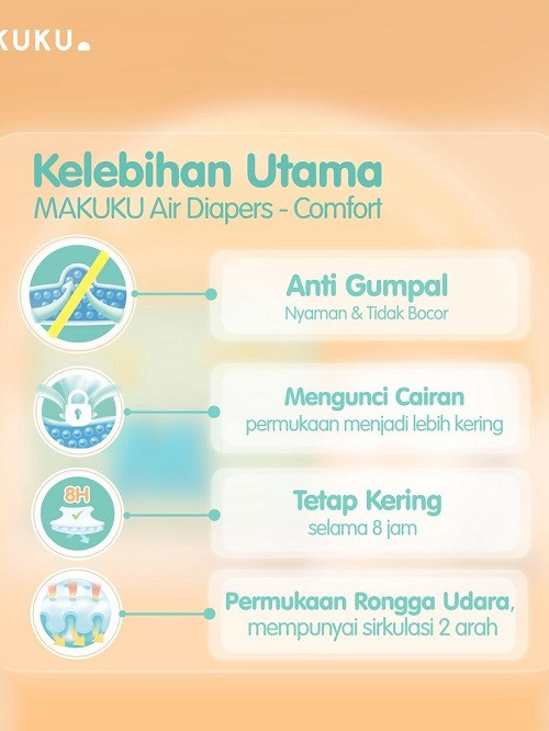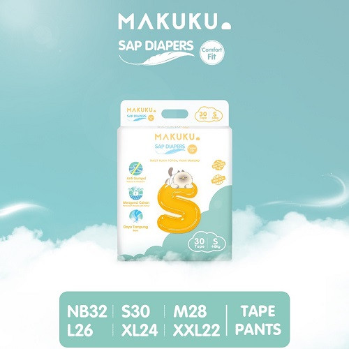 Popok new generation SAP core structure pertama di Indonesia, popok generasi terbaru dengan struktur yang stabil membuat popok makuku tidak mudah menggumpal dan jatuh, serta membuat bayi tidak merasa berat saat bergerak. Penyerapan kecepatan tinggi membuat air yang masuk ke popok akan cepat diserap merata sehingga dapat melindungi pantat bayi dari iritasi. Keunggulan: 1. Anti gumpal/Anti-clumping (with new generation SAP core structure pertama di Indonesia), SAP adalah polymer hidrophilik yang memiliki kemampuan dapat menyerap cairan hingga lebih dari 100x lipat dari berat SAP sendiri. Penyerapan merata dan strukturnya sangat stabil sehingga tidak menggumpal dan jatuh, membuat bayi tidak merasa berat saat bergerak. - Penyerapan cepat, mengunci cairan dengan baik, tidak ada osmosis, mengurangi ruam merah. Ketika bayi duduk ataupun digendong, popok tidak akan osmosis balik. Bagian bawah, samping, dan belakang tidak akan terjadi kebocoran. - Tetap kering selama 8 jam sehingga mengurangi terjadinya iritasi pada kulit si kecil. - Mengurangi kebocoran pada bagian bawah - Mengurangi panas dan lembab, mengurangi terjadi ruam / iritasi pada kulit