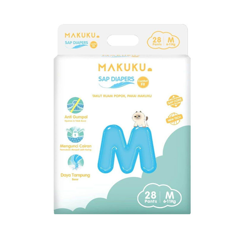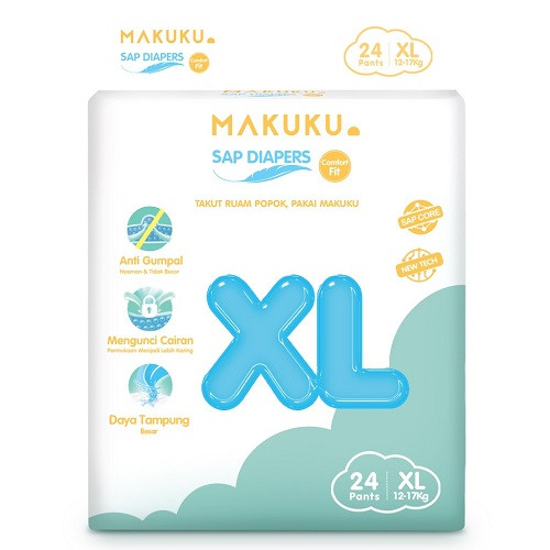 Makuku sap diapers comfort fit merupakan popok new generation SAP core structure pertama di Indonesia, popok generasi terbaru dengan struktur yang stabil membuat popok makuku tidak mudah menggumpal dan jatuh, serta membuat bayi tidak merasa berat saat bergerak. Penyerapan kecepatan tinggi membuat air yang masuk ke popok akan cepat diserap merata sehingga dapat melindungi pantat bayi dari iritasi. Keunggulan : - Tidak menggumpal, sehingga membuat bayi lebih nyaman - Penyerapan merata, sehingga mengurangi kebocoran - Daya serap yang tinggi dan cepat, sehingga menjaga permukaan tetap kering dan mampu secara efektif mengurangi ruam merah pada kulit bayi. - Penyerapan cepat, mengunci cairan dengan baik, tidak ada osmosis dan mengurangi ruam merah. - Popok 3 lapis, celana pull-up tiga lapis yang dilapisi dengan karet elastis di sekitar pinggang, dan bagian tepi di tutupi dengan karet elastis yang lebih fleksible mengikuti berbagai bentuk postur tubuh bayi guna meminimalisir terjadinya kebocoran samping.