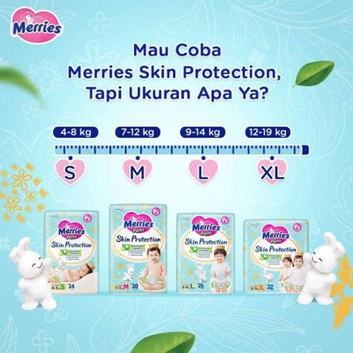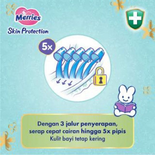 Merries skin protection merupakan popok pertama di Indonesia dengan kandungan ekstrak teh alami yang membuat popok lebih higienis di kulit bayi. Dengan technology hygiene protect, popok lebih higienis dengan adanya lapisan antibakteri. Popok sekali pakai (atau yang sering disebut pempers) yang teruji klinis cegah iritasi, ruam dan gatal pada kulit bayi. Perlindungan ekstra menjaga kulit bayi agar tetap sehat. Keunggulan : - Daya serap tinggi, menjaga kulit bayi tetap kering dengan 3 jalur penyerapan cairan tersebar rata, cepat kering, aman dari kebocoran - Bersirkulasi udara pada seluruh bagian popok meries, kulit bebas bernapas dan nyaman sepanjang hair - Lembut dan nyaman, bahan popok lembut Si Kecil tetap nyaman sepanjang hari