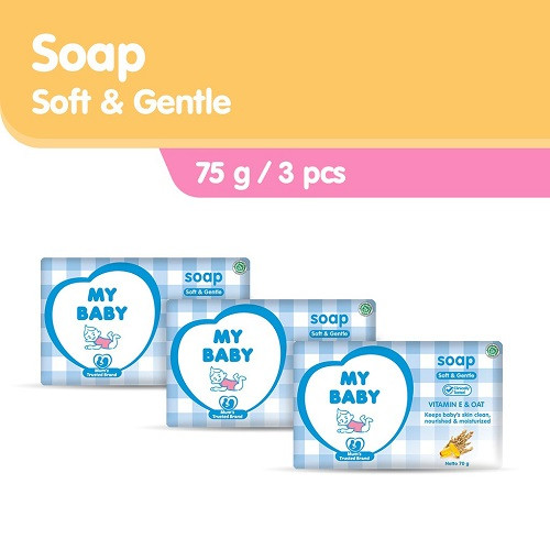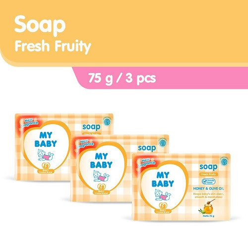 My Baby Bar Soap 75gr merupakan sabun bayi batang yang dapat membantu mencegah iritasi ringan pada kulit bayi yang sensitif, dapat merawat dan menjaga kulit bayi agar tetap sehat. Hadir dengan keharuman buah yang segar akan semakin membuat si kecil tetap wangi dan segar sepanjang hari. Memiliki formula yang lembut dari bahan-bahan alami, baik untuk membersihkan dan menjaga kelembutan kulit bayi. Care & Protect Memiliki kandungan Vitamin E dan Gandum menutrisi dan melembabkan kulit. Fresh Fruity Memiliki kandungan Madu dan Minyak Zaitun yang menghaluskan dan melembutkan kulit Sweet Floral memiliki kandungan Susu dan Gandum menjaga kulit tetap sehat dan lembab.