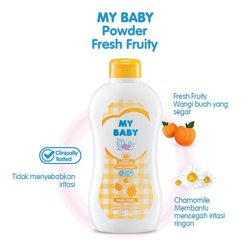 Powder my baby fresh fruity merupakan rangkaian bedak bayi yang telah teruji klinis, dengan formula yang lembut, tekstur yang halus dan mudah merata, membantu menjaga kelembaban dan melindungi kulit bayi yang teramat halus. Kandungan Chamomile membantu mencegah iritasi ringan pada kulit bayi.