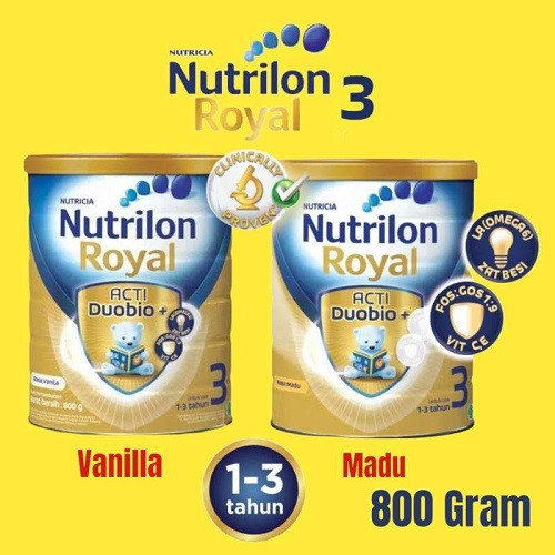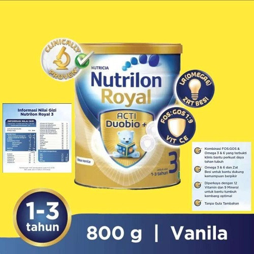Nutrilon Royal 3 dengan ActiDuobio+ Susu Pertumbuhan untuk Anak usia 1-3 tahun Nutrilon Royal 3 dengan kebaikan ActiDuobio+ : 1. Terbukti Klinis* bantu perkuat daya tahan tubuh si Kecil 2. FOS : GOS 1:9 LEBIH TINGGI : satu-satunya susu formula dengan kombinasi FOS : GOS yang dipatenkan untuk dukung daya tahan tubuh 3. OMEGA LEBIH TINGGI : dukung kemampuan berpikir Omega 3 (Asam -Linolenat) 103 mg/saji. Omega 6 (Asam Linoleat) 1274 mg/saji. 4. 0 GULA SUKROSA : tanpa gula tambahan 5. Vitamin C & E Vitamin C membantu dalam pembentukan dan pemeliharaan jaringan kolagen. Vitamin C membantu penyerapan zat besi. 6. Zat Besi Zat besi merupakan komponen hemoglobin di dalam sel darah merah yang membawa oksigen ke seluruh bagian tubuh. Dukung tumbuh kembang anak dan perkembangan anak dengan nutrisi yang tepat. Kandungan susu dapat dilihat pada Informasi Nilai Gizi.
