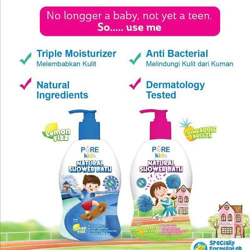 Pure Kids - Natural Shower Bath 300ml Sabun Cair Anak Sabun cair yang diformulasikan secara khusus tanpa kandungan SLS (Sodium Lauryl Sulfate) dan telah teruji secara klinis. Melembabkan dan membersihkan seluruh tubuh serta befungsi sebagai antibakterial untuk melindungi kulit anak-anak dari kuman. Dengan pH Balance yang tepat dan kandungan Aloe Vera, Vit E & Provit B5.