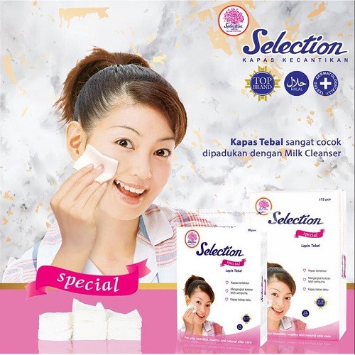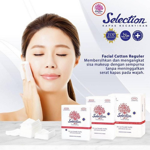 Kapas selection facial cotton merupakan kapas kecantikan sekali pakai. Manfaat : - Untuk perawatan dan membersihkan kotoran wajah - Meratakan air pembersih dan cleansing milk - Dapat digunakan sebagai perawatan kulit bayi - Dapat digunakan sebagai puff - Dapat dipakai pembersih luka, karena bebas bahan berbahaya Varian : - Selection Kapas Kecantikan 35gr - Selection Kapas Kecantikan 50gr - Selection Kapas Kecantikan 75gr - Selection Kapas Special Tebal 120s - Selection Kapas Special Tipis 175s - Selection Kapas Special Tipis 60s