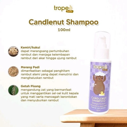 Shampoo kemiri tropee bebe adalah shampoo alami dengan perpaduan wangi bunga mawar dan lavender. Shampoo kemiri tropee bebe dibuat dengan ekstrak bahan alami yang dapat membersihkan rambut secara maksimal tanpa membuat kulit kepala si kecil menjadi kering, sekaligus memelihara kesehatan rambut dan membantu pertumbuhan rambut si kecil. Keunggulan : - Tidak menggunakan SLS, Detergen, Paraben ataupun Pewarna - Tidak pedih di mata sehingga nyaman digunakan untuk bayi newborn dan anak. - Membantu merangsang pertumbuhan rambut dan meng-hitamkan rambut - Membantu memelihara kesehatan rambut Bahan Utama : - Kemiri : dapat merangsang pertumbuhan rambut dan menjaga kelembapan rambut dari akar hingga ujung rambut. - Merang Padi : dimanfaatkan sebagai penghitam rambut alami yang dapat menutrisi dan menghaluskan rambut. - Getah Pisang : mengandung zat yang bermanfaat untuk menggantikan sel-sel kulit kepala yang mati, serta mencegah kerontokan dan menyuburkan rambut. Cara Pemakaian : - Basahi rambut, tuangkan secukupnya. - Gosok hingga berbusa sampai merata - Diamkan 1-2 menit lalu bilas dengan air bersih.