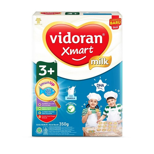 Susu vidoran Xmart 3+, untuk usia 3-5 tahun. Susu vidoran Xmart 3+ merupakan susu pertumbuhan pertama dengan imunUp yang diperkaya dengan Cod Liver Oil (minyak hati ikan kod), Omega 3&6, Inulin, Sumber Protein, Sumber 12 Vitamin dan 6 Mineral untuk membantu mengoptimalkan tumbuh kembang anak.