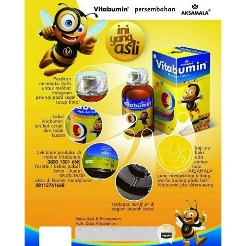 Khasiat Vitabumin untuk anak : - Membantu meningkatkan nafsu makan dan berat badan - Meningkatkan daya tahan tubuh - Meningkatkan konsentrasi dan kecerdasan - Membantu Mempercepat penyembuhan Anak yang sedang sakit Komposisi: Madu, temulawak Berat bersih: 130ml Disertai Kode Verifikasi Keaslian Produk Aturan pakai : 1 th 2x2 sendok teh 2 - 3 th 2 x2 sendok makan 4 -